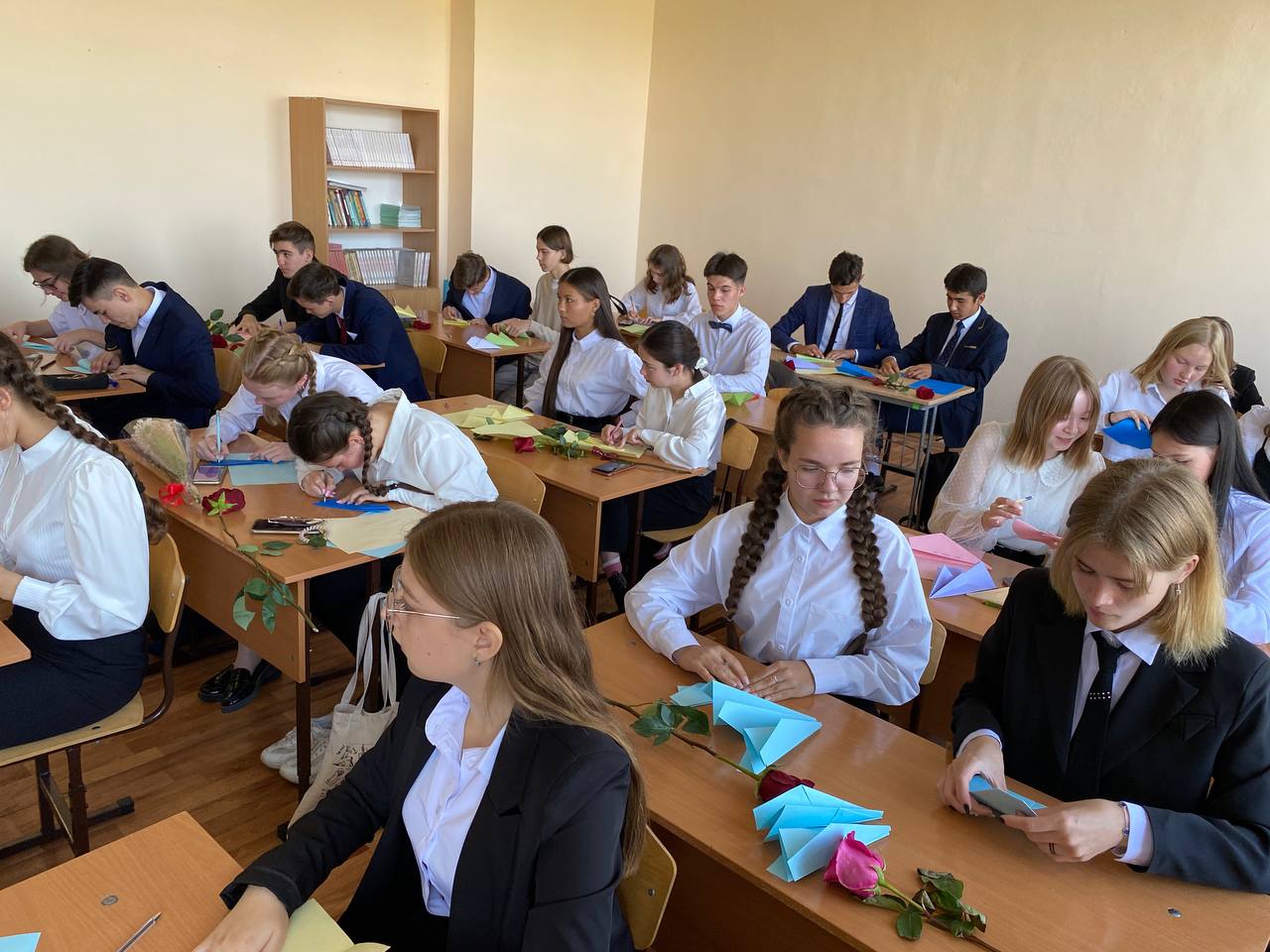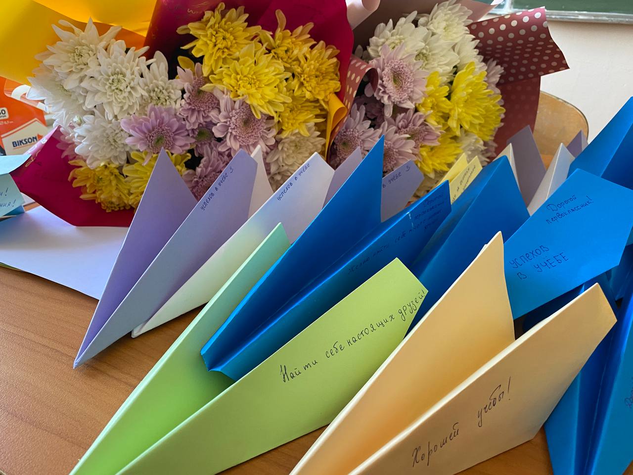 С этого года появились и новые традиции. Одиннадцатиклассники приготовили послания и пожелания на самолётиках для первоклассников, которые вручили на первом классном часу.