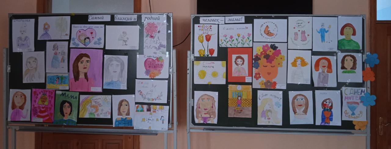 Ко дню матери в гимназии была сделана выставка рисунков, также ребята сделали фотокаллажи, видеопоздравления, где читали стихи пели песни и танцевали.