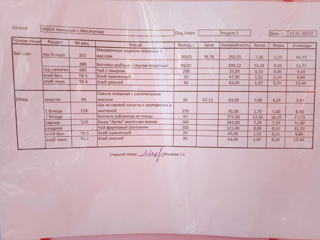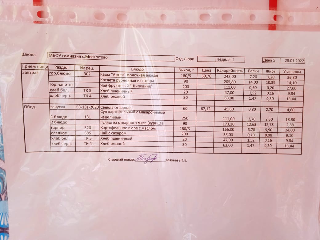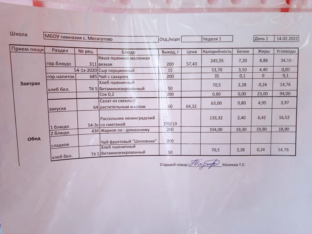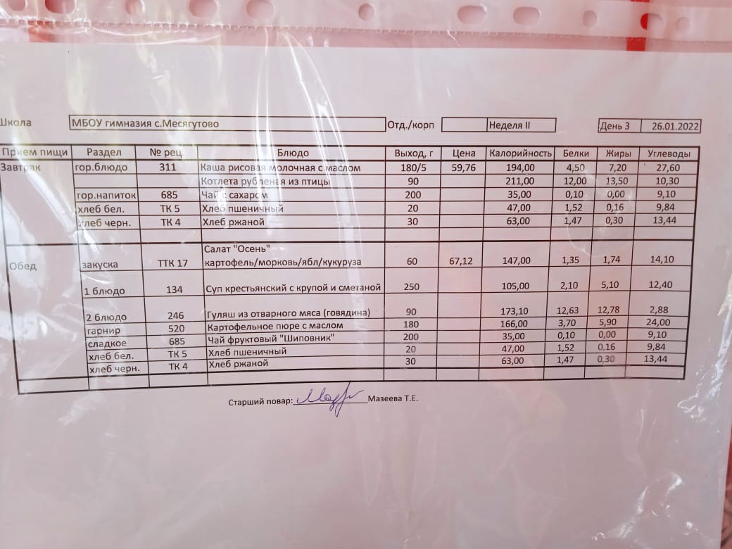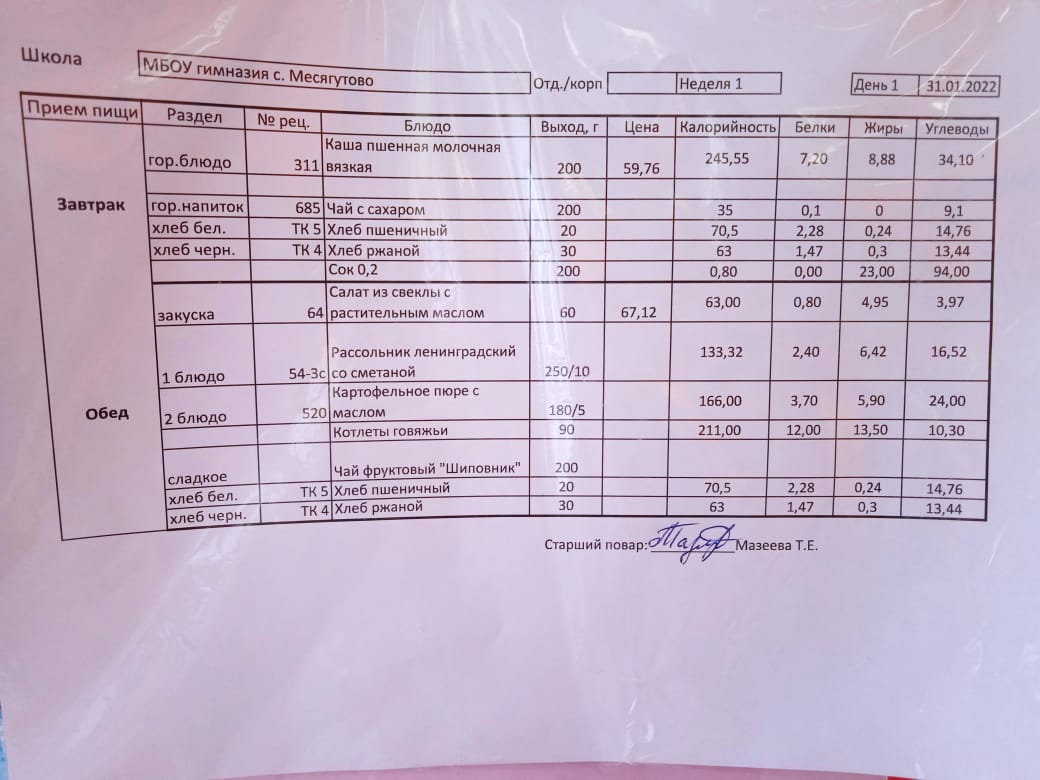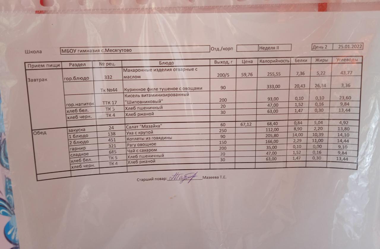 Утвержденное ежедневное меню и фото