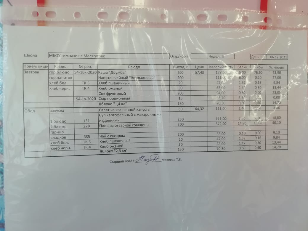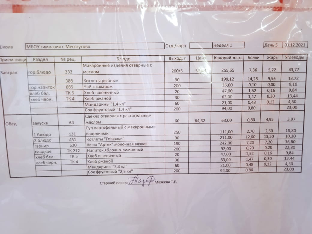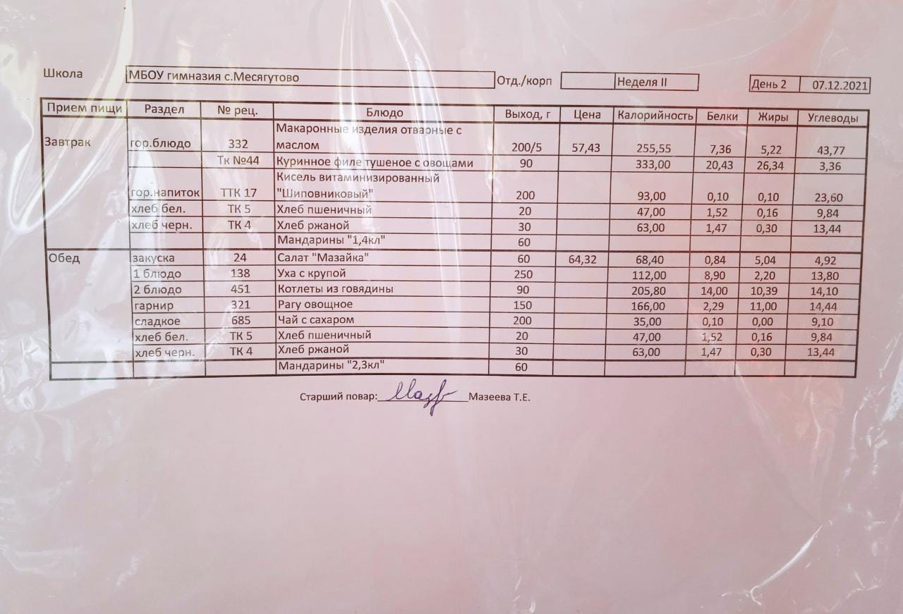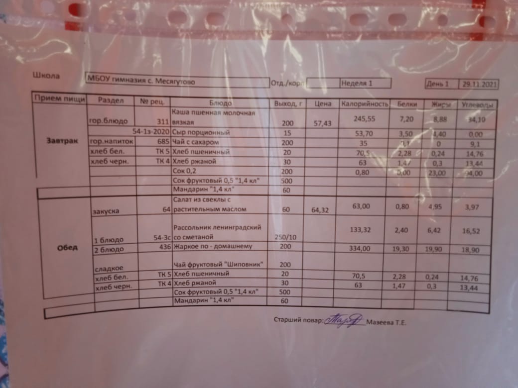 Утвержденное ежедневное меню и фото