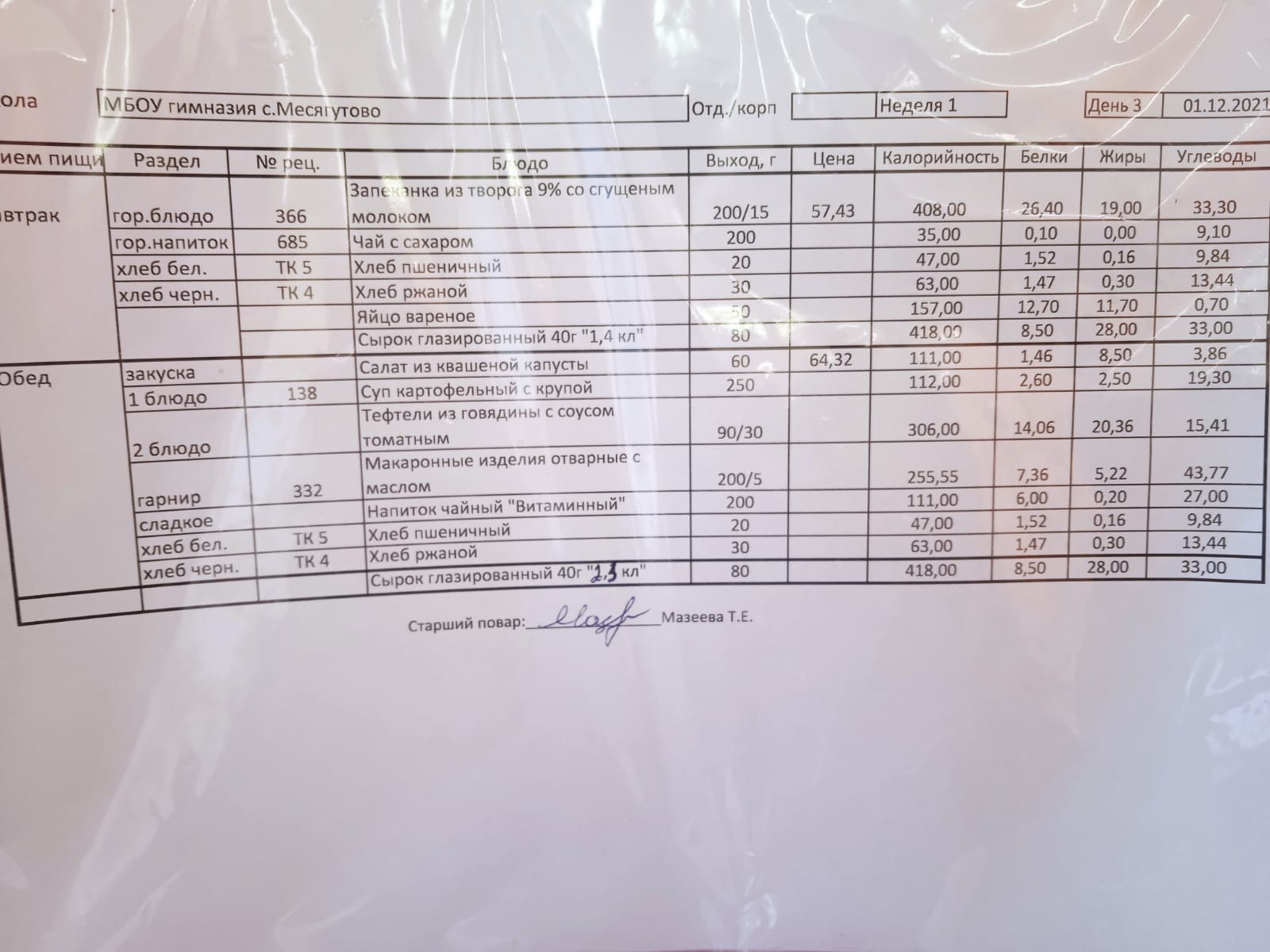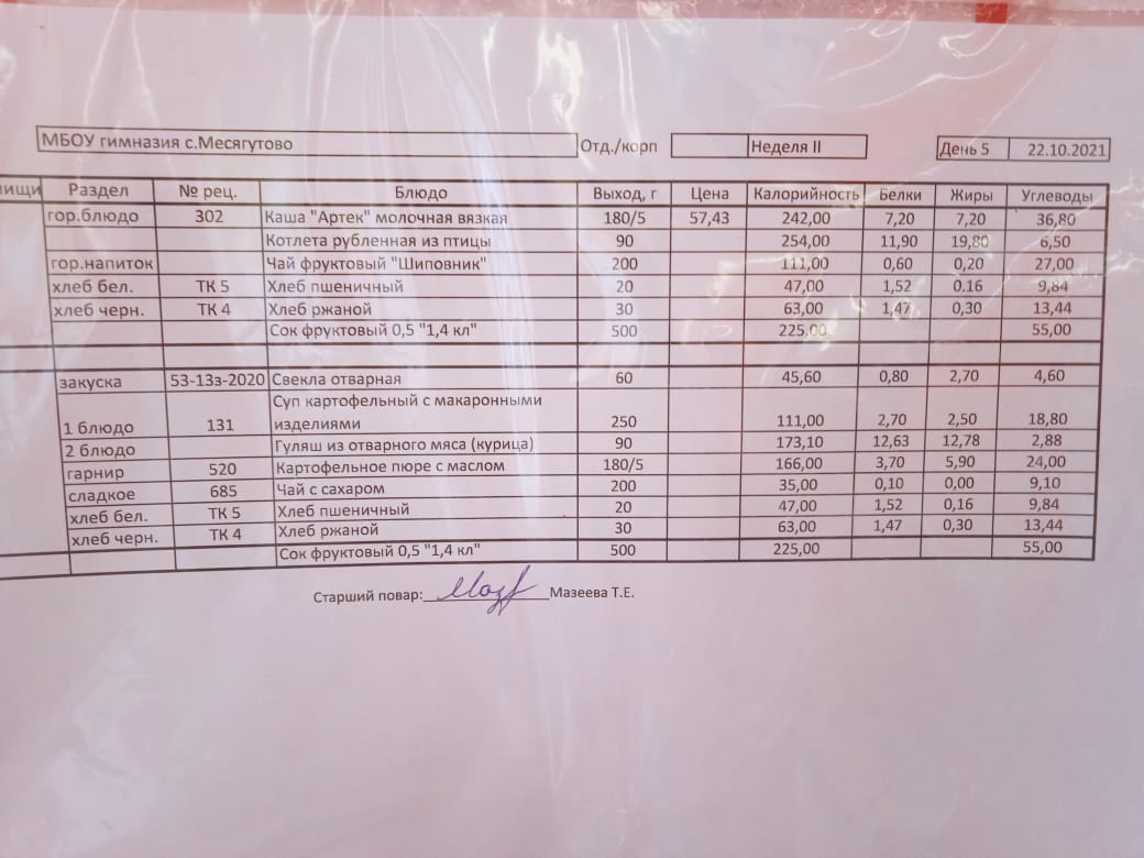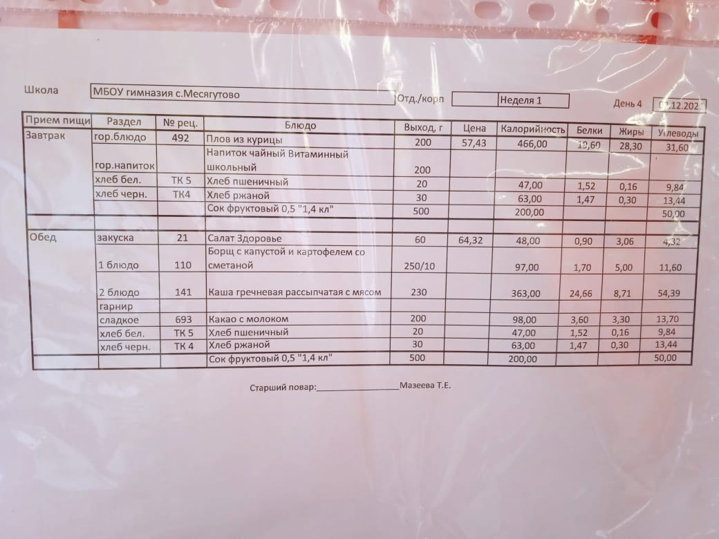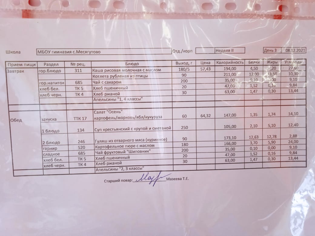 Утвержденное ежедневное меню и фото