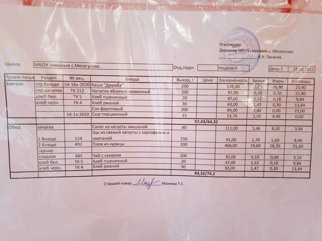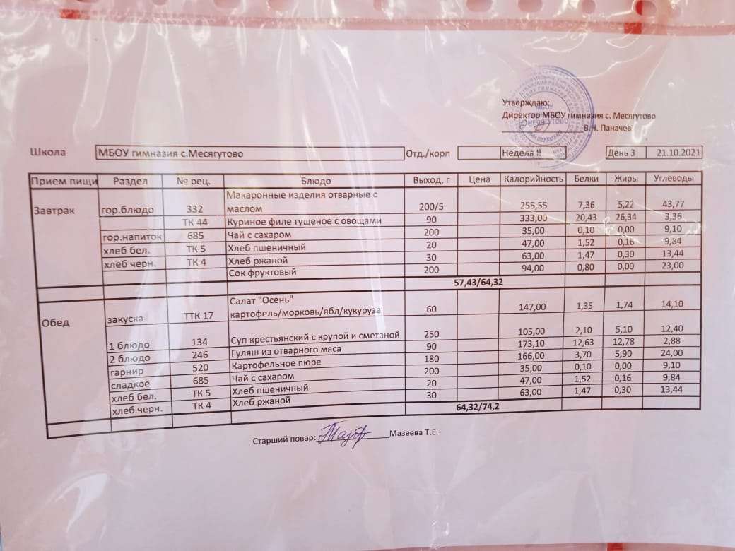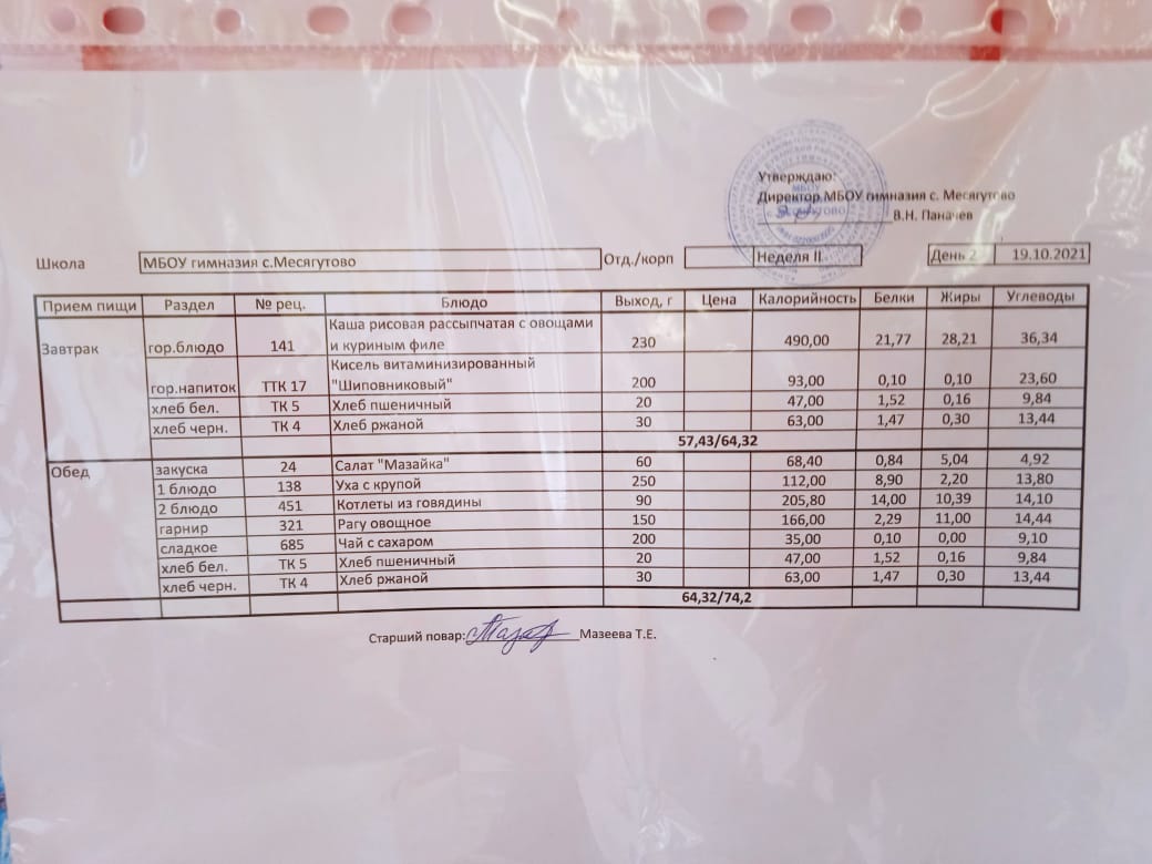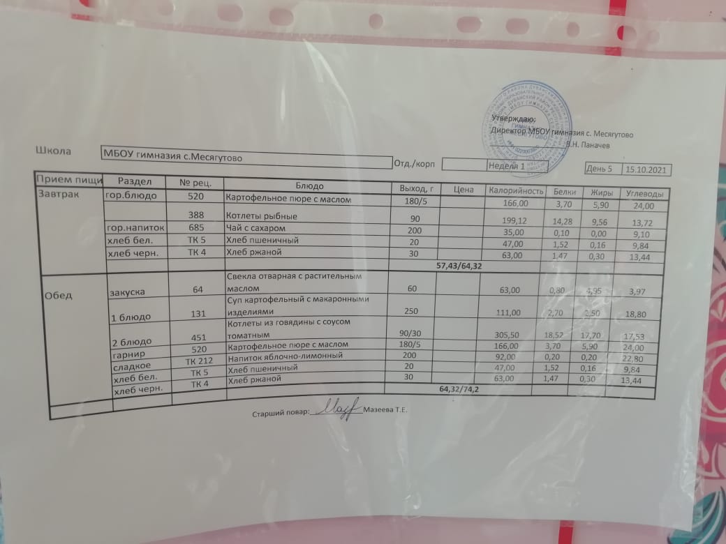 Утвержденное ежедневное меню и фото